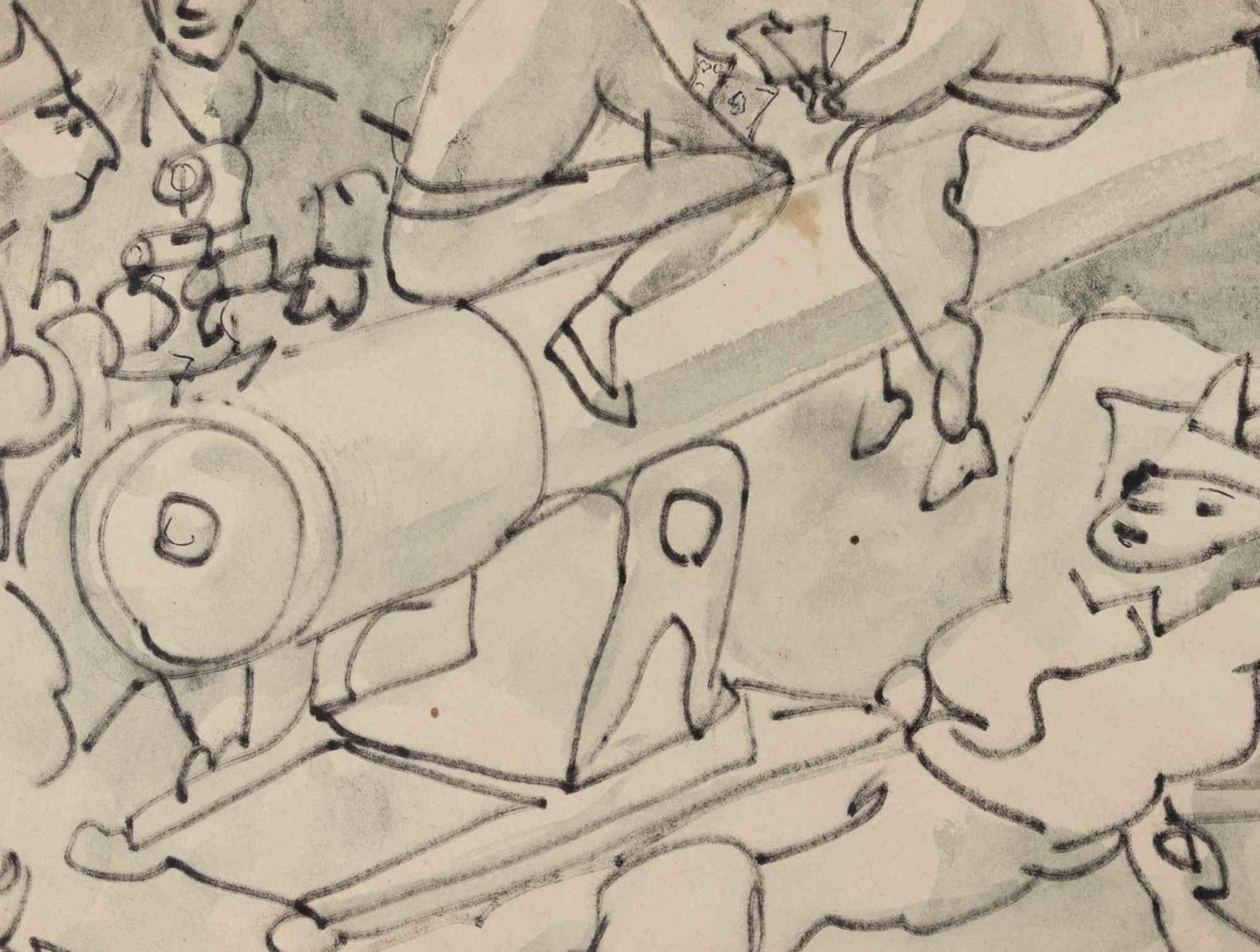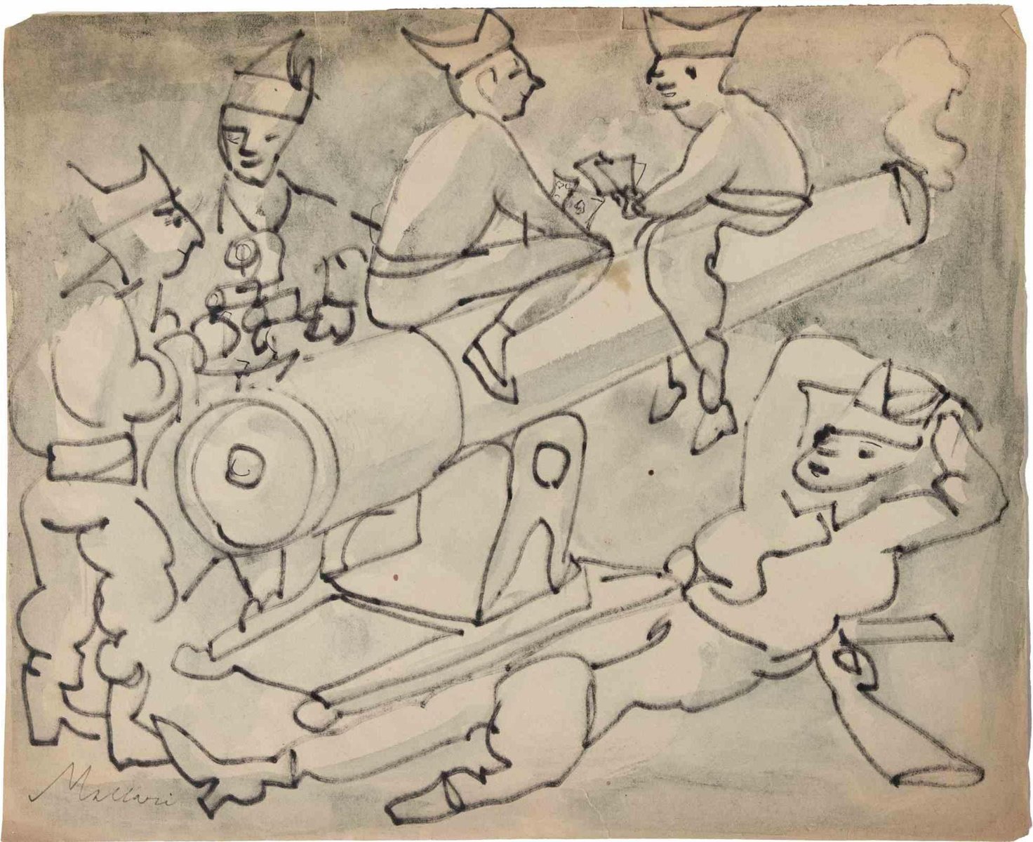 Mino Maccari, Soldiers, Mixed Media on Paper, Mid-20th Century