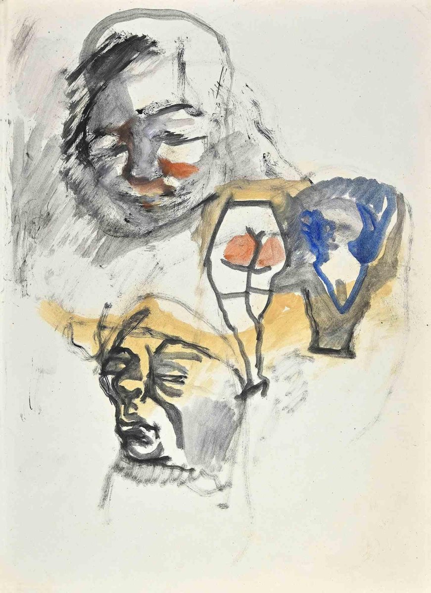 Mino Maccari, The Faces, Original Ink & Watercolor, Mid-20th Century