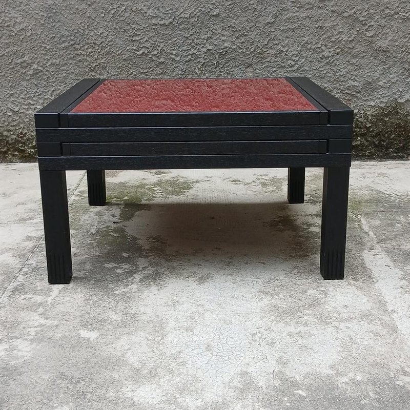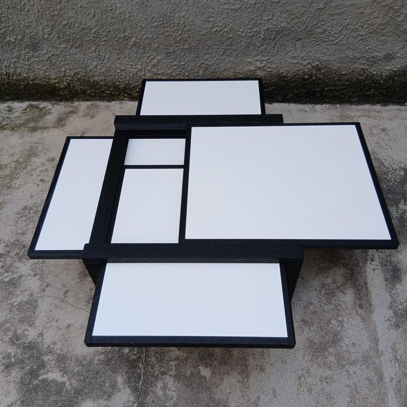 Keywords: coffee table, modular design, Bernard Vuarnesson, Bellato, 1980s, red and white laminate, black wood, convertible coffee table, sliding coffee table, vintage furniture, French design, wood carving, reversible coffee table, pull-out coffee table coffee table, modular design, Bernard Vuarnesson, Bellato, 1980s, red and white laminate, black wood, transformable table, sliding panels, vintage furniture, French design, wood joinery, reversible table, extendable coffee table Extraordinary modular coffee table designed by Bernard Vuarnesson for the Italian company Bellato in the 1980s. The "Hexa" model is distinguished by the compositional elegance and extraordinary engineering of its sliding panels, which can radically transform the usable surface area through a simple gesture. The solid wood frame with an open-pore satin-black painted finish accommodates four laminate-covered sliding tops: two white and two red, which can be combined in various geometric configurations. The mechanism is entirely wooden, made with such precision that no metal components are required. The notches are perfect, allowing smooth, quiet and continuous movement. A true masterpiece in functional design. In excellent vintage condition, with slight signs of age consistent with age and use. Fully functional mechanism, well-preserved surfaces. Variable footprint depending on panel opening.