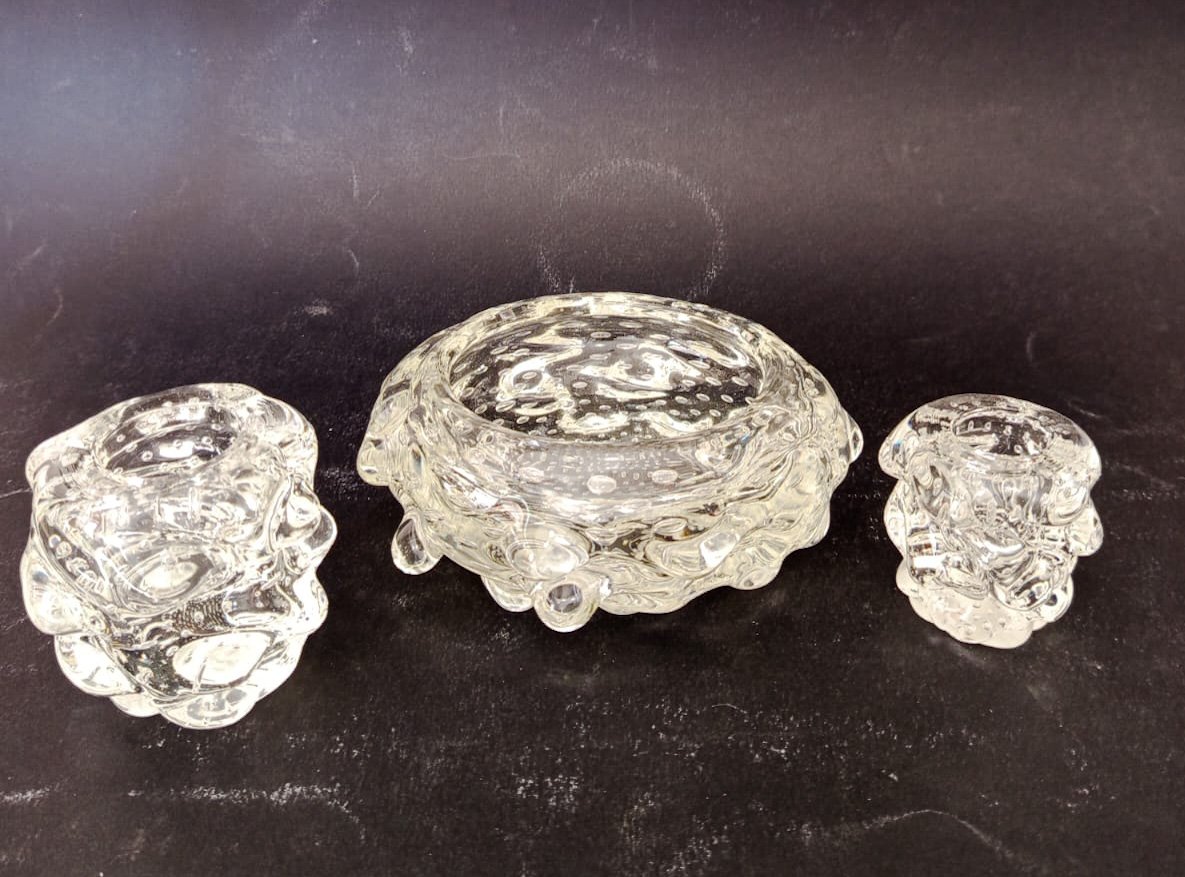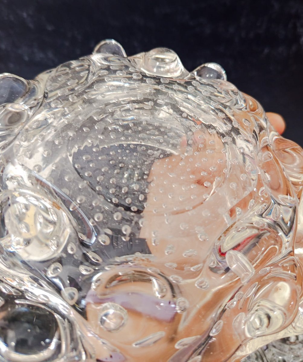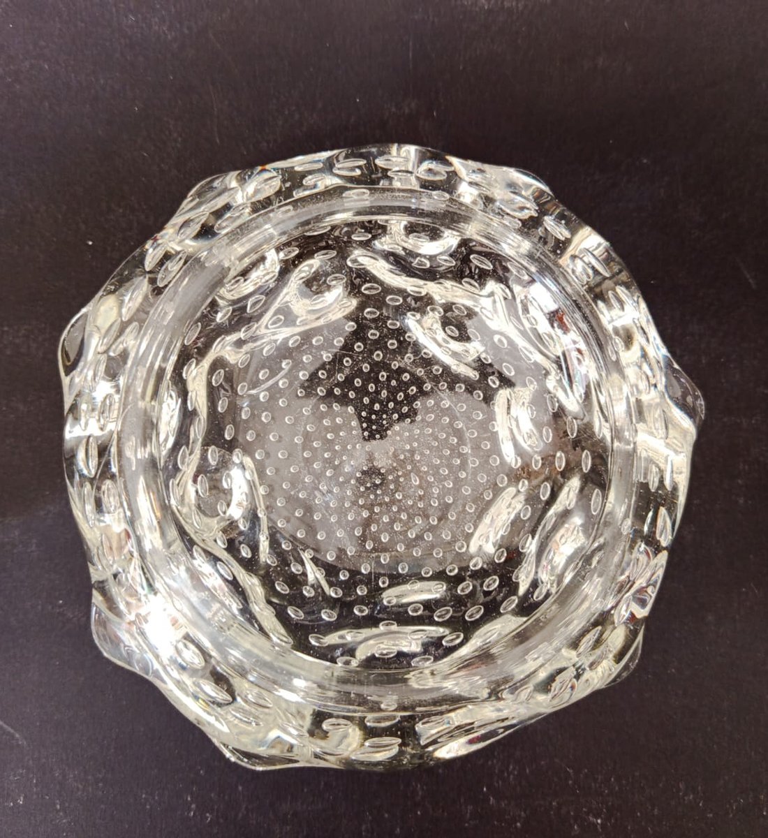 During the 1930s, Ercole began experimenting with heavier, more sculptural glass forms that feature uneven surfaces and handles. Comprising large, cylindrical elements decorated with crystal pyramids, Ercole’s Rostrato series (1938) is among the most beloved and copied Barovier collection from this period. Onward through his tenure, which ended in 1972, Ercole would continue to innovate and explore, jaunting through such novel styles as the complex, polychrome abstractions of the Oriente series (ca. 1940s) of vases and bowls; the serpentine Spiral patterns (ca. 1950s); the pebbly textured Barbarico line (ca. 1950s) made from oxides placed on glass; and the Pezatto series (ca. 1950s and 1960s), which often used strongly contrasting mosaic pieces.