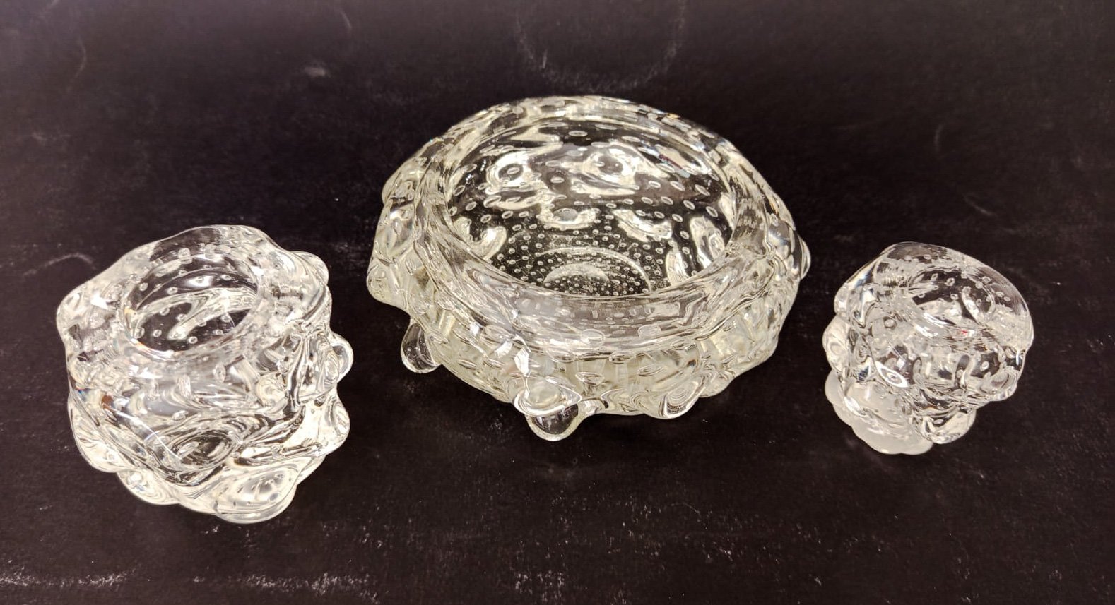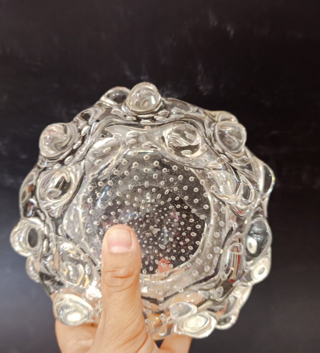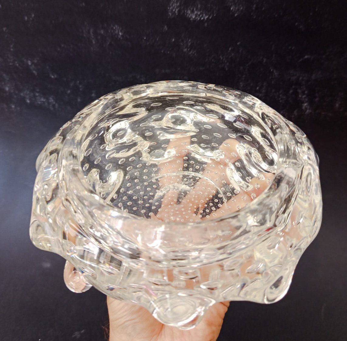 During the 1930s, Ercole began experimenting with heavier, more sculptural glass forms that feature uneven surfaces and handles. Comprising large, cylindrical elements decorated with crystal pyramids, Ercole’s Rostrato series (1938) is among the most beloved and copied Barovier collection from this period. Onward through his tenure, which ended in 1972, Ercole would continue to innovate and explore, jaunting through such novel styles as the complex, polychrome abstractions of the Oriente series (ca. 1940s) of vases and bowls; the serpentine Spiral patterns (ca. 1950s); the pebbly textured Barbarico line (ca. 1950s) made from oxides placed on glass; and the Pezatto series (ca. 1950s and 1960s), which often used strongly contrasting mosaic pieces.