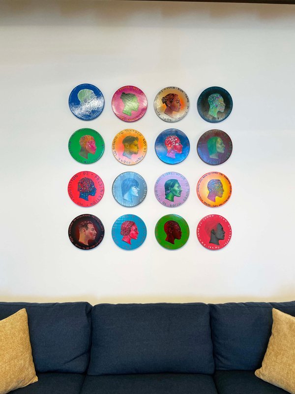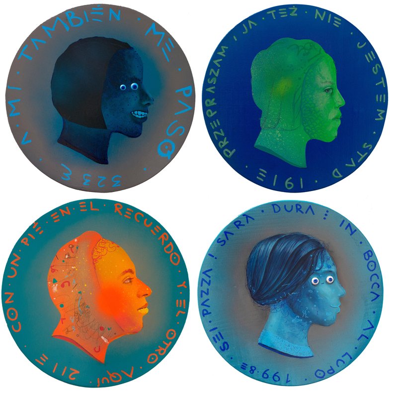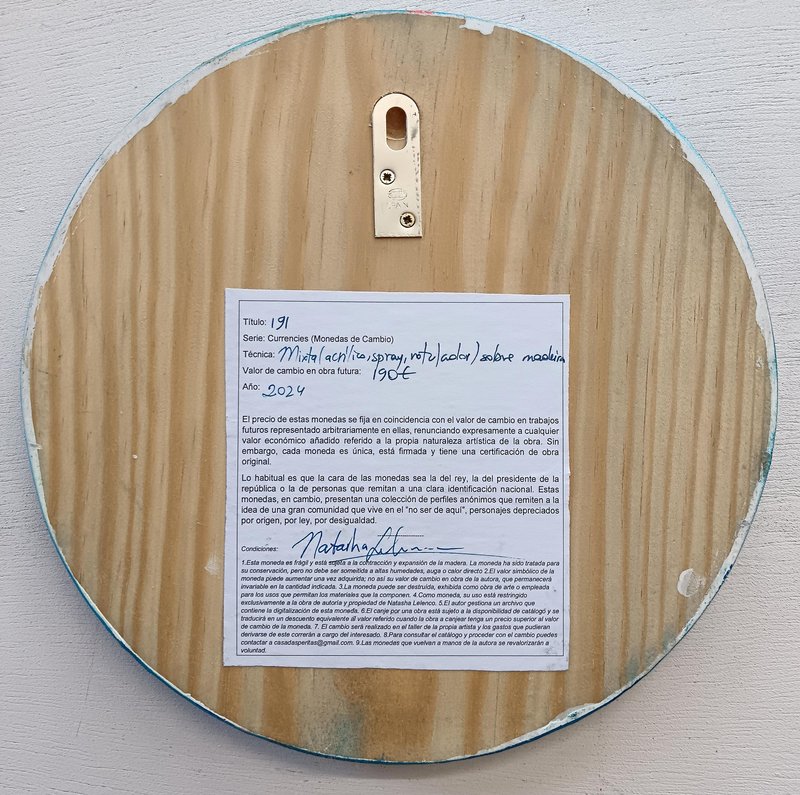 This set of four original works by Natasha Lelenco belongs to the "Exchange Currencies" series, a project that reflects on migration, foreignness, and the human experience of displacement. Each piece is meticulously painted on treated circular pine wood, highlighting the artist’s exploration of identity and belonging through portraiture. The portraits, titled "Currency #208," "Currency #243," "Currency #216," and "Currency #195," feature anonymous faces accompanied by evocative texts in different languages, addressing themes of alienation, cultural identity, and the shared human experience. By pairing these emotive texts with vibrant colors and detailed acrylic painting, Lelenco blurs the line between the natural and digital, as well as the personal and universal. This product consists of artworks that can also be purchased individually on our storefront. The set, offered at a more economical price than purchasing separately, will only be available as long as all individual pieces remain available. Technically, these artworks are crafted on sculptural wooden panels, with a 2cm thickness that emphasizes their dimensionality and tactile presence. The edges of the pieces have been worked on as part of the composition, allowing them to function individually or as part of a larger panel arrangement. The series challenges traditional notions of coinage, replacing symbols of power and nationalism with anonymous, empathetic figures, each conveying the emotional weight of migration and the complex layers of human connection. This panel of four offers a dynamic and thought-provoking narrative when displayed together, emphasizing the universality of the themes they address. Natasha Lelenco invites the viewer to engage with these works not only as art but as artifacts of shared human experience, making them ideal for collectors interested in contemporary art, migration, and identity. Keywords: Natasha Lelenco, original paintings on wood, Exchange Currencies series, migration art, foreignness themes, anonymous portraiture, contemporary art set, human identity, cultural displacement, sculptural wooden panels, collectible art.