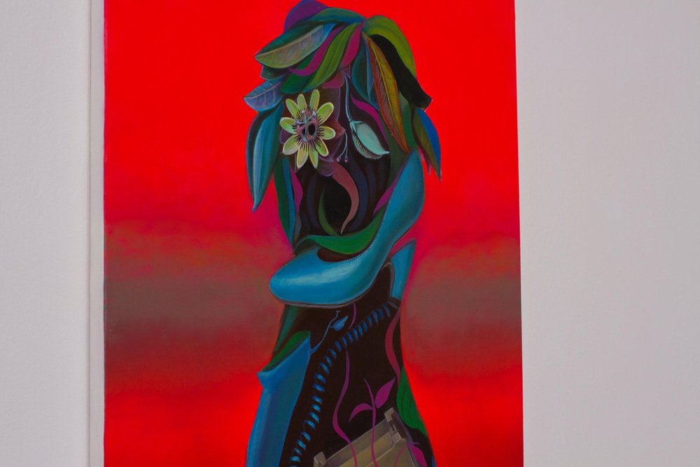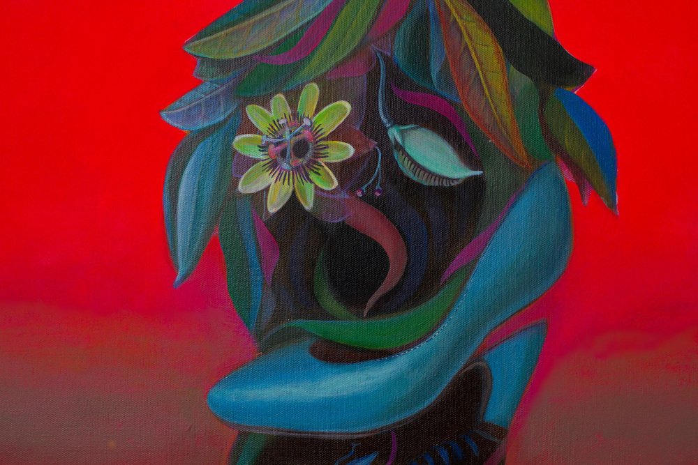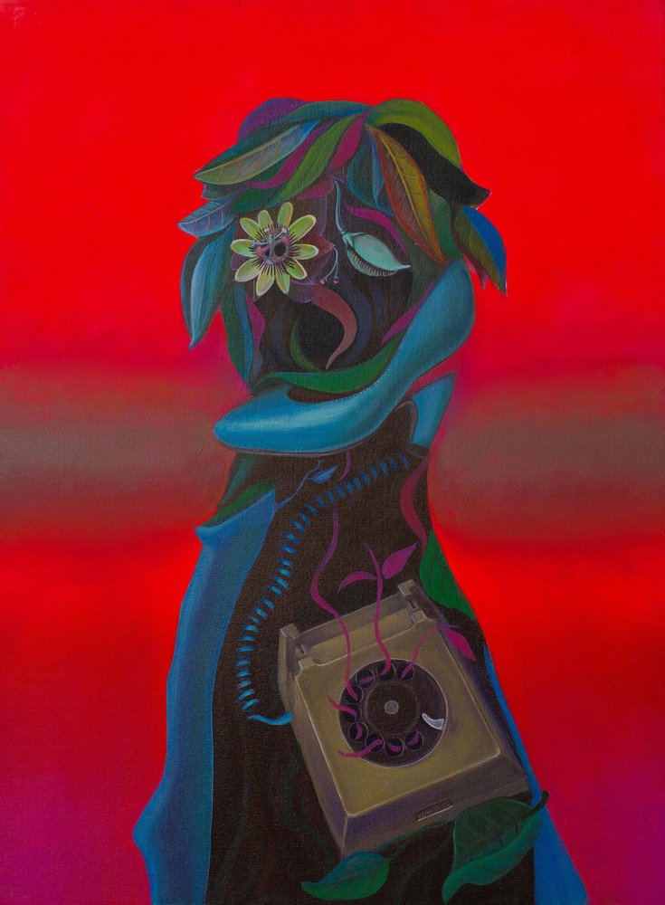 This painting is one of the works from the "Fetishes" series that Natasha Lelenco created throughout the year 2022 to be featured in the international exhibition Nordart 2022 in Büdelsdorf, Germany. Artist Natasha Lelenco paints a surreal image of plants and everyday items such as a shoe or a telephone resembling the human form. She constructs a pareidolia using botanical and popular elements, creating an image that humorously references the popular 80s song by Steve Wonder from which she borrows the title "I Just Called to Say I Love You". Part of a subset within her Fetishes series, where she draws from musical memory in conjunction with her visual memory. The composition addresses the theme of humanity's role as just another part of the community of the living. This collection features portraits crafted from a combination of thematic elements related to popular iconography, advertising, and the human experience within the living community. The artwork is midway between figuration, portraiture, still life, and abstraction. Lelenco's "Fetiches" series melds portraiture and anthropomorphic forms, achieved through a meticulous accumulation of elements. These elements intertwine with a nuanced thematic exploration, touching upon both kitsch and popular iconography. The series also delves into the inseparable connection between humanity and the larger living community. Drawing from her personal biography, Natasha Lelenco constructs a dialogue between memory and imagery. Through a skillful process, she resurrects fragments of her past to craft fresh narratives that challenge conventional perceptions of existence. This narrative depth, coupled with psychological complexity, echoes classical influences, seamlessly bridging the gap between Renaissance portraiture and contemporary expression. Notably, Lelenco's "Fetiches" series echoes the artistic echoes of Italian painter Giuseppe Arcimboldo. These pieces have been designed to function individually or to be combined into multiple panels, engaging in dialogue with other artworks from the same series. Natasha Lelenco, born in Chișinău, Moldova in 1982, is a prominent Moldovan painter and contemporary artist who has been residing in Galicia, Spain, since 2008. She is especially known for her figurative work, particularly in the realm of portraiture. Holding a degree in Fine Arts from the University of Cluj-Napoca in Romania, her art has been featured in numerous international exhibitions and art fairs, exploring themes such as memory, the human as an integral part of the community of the living, and popular imagery. Natasha Lelenco's art has been showcased across exhibitions in Spain, Germany, Denmark, Portugal, Mexico, and USA. More than 40 works of these series has already found its home in private collections worldwide.
