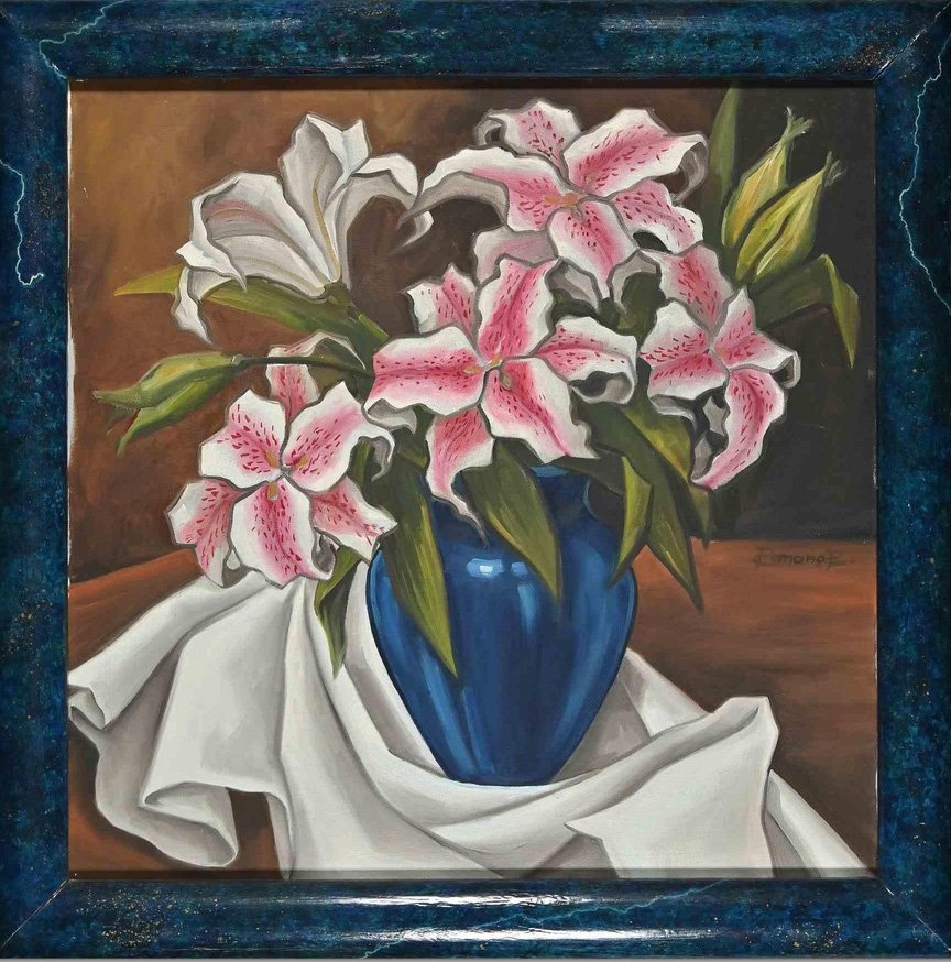 Raffaele Romano, Lilium in Blue Vase, 1998, Oil on Canvas, Framed