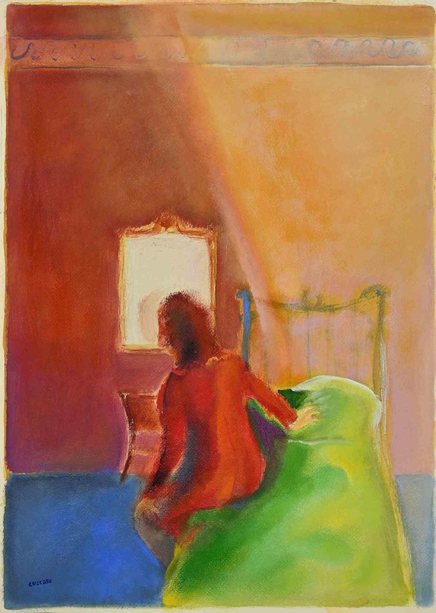 Roberto Cuccaro, Woman on the Bed's Edge, Original Gouache on Paper, 2000s