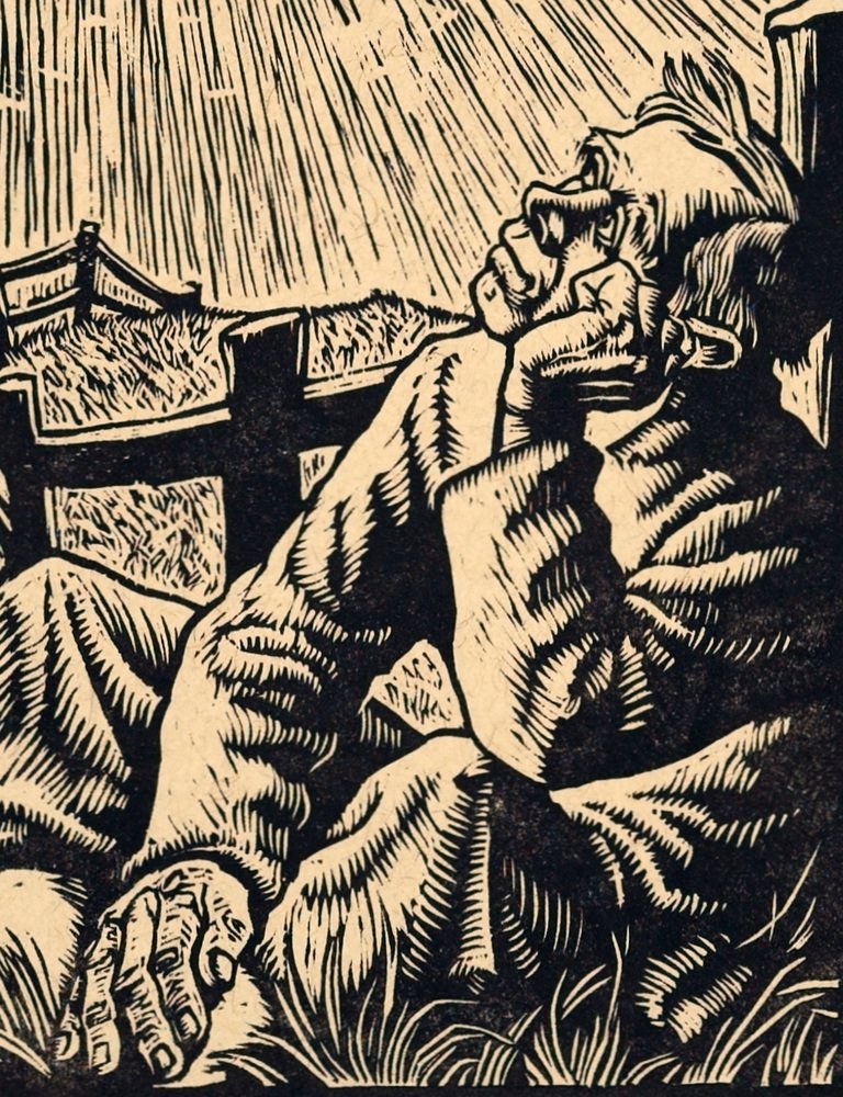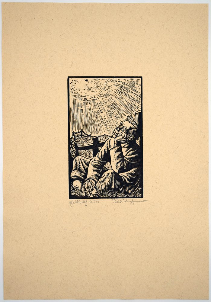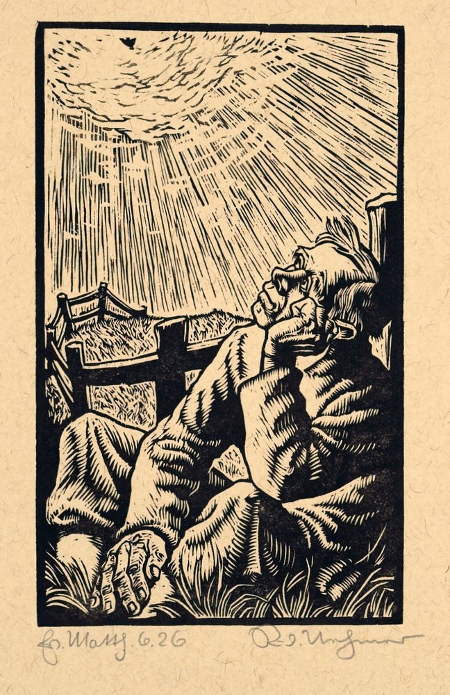 This woodcut is part of Nehmer's most famous series, his pictorial interpretation of the Sermon on the Mount (Matth. 5,1-7,29), created shortly after the end of World War II. The print illustrates the verse: Look at the birds of the air: they do not sow, they do not reap, they do not gather into barns, and yet your heavenly Father feeds them. Are you not much more than they? (Matth. 6,26).