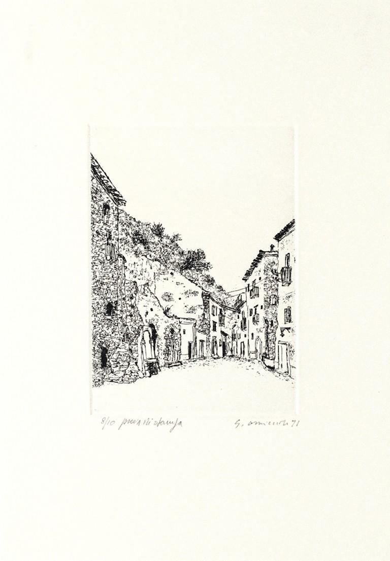 Scilla is a beautiful etching on cardboard, realized in 1971 by the Italian artist Giovanni Omiccioli (Rome, 1901-1975). Hand-signed in pencil on the lower right and dated. Numbered on the lower left, edition of 8/10 prints. In very good conditions Included a white Passepartout: 49 x 34 cm. The artwork represents the landscape of beautiful houses along the narrow alley in Scilla through soft and delicate strokes. Scilla is a small admirable town located on the Tyrrhenian coast of Calabria. Scilla is very ancient, rich in mythology, history, legend, and poetic images that fed for millennia by the suggestiveness of the natural environment. Giovanni Omiccioli was an Italian painter belonging to the modern movement of the Scuola romana with dynamic paintwork. Having joined the Scuola Romana movement, in 1928, Omiccioli collaborated especially with Mario Mafai and Antonietta Raphael, as well as with Scipione and Raffaele Frumenti. His pictorial activity started in 1934 and a few years afterwards, he exhibited work at the IV Mostra del Sindacato Fascista (1937) within the Fine Art circle. In the same period he held his personal expo at Apollo Gallery in Rome. Omiccioli was also active in politics and, with Mario Mafai, Guttuso and Afro, he created the first header of the Italian communist newspaper L’Unità in 1945, immediately after the Italian Liberazione. During the same year he exhibited at the I Mostra dell’Arte against barbarism, promoted by this newspaper at the Gallery of Rome with catalogue by Antonello Trombadori, presenting a dramatic political painting by the title “La fucilazione di Bruno Buozzi”. After winning an award at the Marzotto Prize Convention, with “Il Pastore con la capretta”, Omiccioli exhibited at many important art centers: especially noticeable are his anthological displays at the Hermitage of Leningrad, his personal at the La Medusa Modern Gallery of Naples, and in the 1950s his participation in exhibitions at Pittsburgh, Boston, and Tokyo. He also took part in a travelling exhibition around the Scandinavian countries organised by the Italian Art Club, as well as displaying some paintings at the various Rome Quadriennale of 1955, 1959 e poi del 1966, and at the Venetian Biennale of 1952, 1954, 1956. In 1959 he also presented a religious painting on hardboard, Cristo crocifisso (Crucified Christ), at the VIII Biennale d’Arte Sacra in Bologna. During the 1960s, Omiccioli exhibits at three Figurative Arts Reviews in Rome and Lazio (1961, 1963, 1965) and at the VI Biennale of Rome in 1968.[3] Vaporous and tender, and yet always springing from an unchangeably intense love for nature and man, his palette of colours give a soft breath of light and a suggestive atmosphere to his whole artistic production.