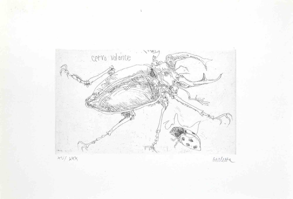 Insects is an etching realized by Sergio Barletta in 1974. Hand-signed in pencil on the lower right. Numbered on the lower left in Roman numerals, from the edition of XXX prints. Titled in Italian at the top left "Cervo Volante" . In very good conditions. Here the artwork represents insects through confident strokes, perfectly created, Sergio Barletta (1934), is an Italian cartoonist and illustrator, who has also published some humorous and political satire books. from the age of 22 is active in Rome, where he worked as an illustrator and art director in some monthly magazines like “Costume”, Diners Club house organ, BP Review, IBM, and others. In 1965 started the joint-working with Marino Gallery in Rome, and in 1966 in Milan with Humour Graphic’s group, at Levi Gallery and others in the following years. In these years graphic work and illustration are mixed with painting and photography, also with satirical drawings for Rinascita, weekly of the Italian communist party; Azione Sociale, weekly of ACLI Catholic Workers Association; movie posters, advertising for Gucci, some writings for Popular Photography Italiana, lay-outs, writings and illustrations for Avinews, bimonthly for tour operators and so on. During the eighties he starts a long co-operation with satirical weekly “Il Sale”, complemented by a book with Ottaviano edizioni in Milan and others publications in Turin and Rome, all of satirical drawings. In this period he collaborates with Linus, the most important Italian comics monthly, and Harakiri, a humour weekly published in France. Personal and group exhibitions of paintings, collages, drawings, photographs Galleria Marino – Roma, 1965 Galleria Levi – Milano, 1966 Galleria Petronio – Bologna, 1967 Galleria d’arte moderna Villa Reale – Milano, 1967 Palazzo Costanzi – Trieste, 1967 Galleria del Naviglio – Milano, 1967 Galleria Marino – Roma, 1967 Galleria Libreria Renzo Cortina – Milano, 1968 Galleria Libreria Renzo Cortina – Milano, 1969 Society Art’s Club – Messina, 1970 Galleria Marino – Roma, 1970 Galleria Libreria Renzo Cortina – Milano, 1972 Galleria Marino – Roma, 1972 Galleria Il Diaframma – Milano, 1973 Galleria Libreria Renzo Cortina – Milano, 1974 Galleria Il Ventaglio – Firenze, 1975 Galleria Marino – Roma, 1975 Palazzo Gonfalonieri – Milano, 1976 Bedford House Gallery – London, 1977 Galleria Apicella – Bonn, 1979 Civico Museo Archeologico – Milano, 1980 Palazzo Barberini – Roma, 1981 Palazzo delle Stelline – Milano, 1981 Castello Sforzesco Biblioteca Trivulziana – Milano, 1982 Civico Museo Archeologico – Milano, 1983 Biblioteca Sormani – Milano, 1983 Club Migros – Milano, 1985 Centrodomus – Milano, 1985 Galleria Vittorio Emanuele – Milano, 1988 Galleria d’Arte ex libris – Roma, 1989 Civico Museo Archeologico – Milano, 1989 Palazzo delle Stelline – Milano, 1990 Palazzo d’Arte – triennale Milano, 1991 Galleria Molica Guid’Arte – Roma, 1991 Molica Gallery, West Broadway – New York, 1991 Civico Museo Archeologico – Milano, 1992 Palazzo Mediceo – Serravezza, 1994 Lalit Kala Akademi – New Delhi, 2005 Birla Academy of Art and Culture – Calcutta, 2005 Galleria Marino – Roma, 2011