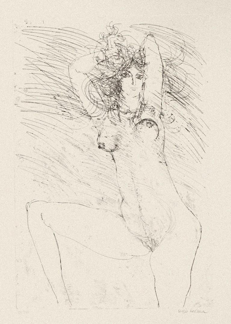 Nude is an original etching realized by Sergio Barletta in 1980 ca. Hand-signed on the lower right in pencil. Numbered, edition of 13/50 prints, on the lower left in pencil. In very good condition. The artwork represents a posing nude through confident and quick strokes. Sergio Barletta (1934) is an Italian cartoonist and illustrator, who has also published some humorous and political satire books. From the age of 22 is active in Rome, where he worked as an illustrator and art director in some monthly magazines like “Costume”, Diners Club house organ, BP Review, IBM, and others. In 1965 started the joint-working with Marino Gallery in Rome, and in 1966 in Milan with Humour Graphics group, at Levi Gallery and others in the following years. In these years graphic work and illustration are mixed with painting and photography, also with satirical drawings for Rinascita, weekly of the Italian communist party; Azione Sociale, weekly of ACLI Catholic Workers Association; movie posters, advertising for Gucci, some writings for Popular Photography Italiana, lay-outs, writings and illustrations for Avinews, bimonthly for tour operators and so on. During the eighties he starts a long co-operation with satirical weekly “Il Sale”, complemented by a book with Ottaviano edizioni in Milan and others publications in Turin and Rome, all of satirical drawings. In this period he collaborates with Linus, the most important Italian comics monthly, and Harakiri, a humour weekly published in France. Personal and group exhibitions of paintings, collages, drawings, photographs Galleria Marino – Roma, 1965 Galleria Levi – Milano, 1966 Galleria Petronio – Bologna, 1967 Galleria d’arte moderna Villa Reale – Milano, 1967 Palazzo Costanzi – Trieste, 1967 Galleria del Naviglio – Milano, 1967 Galleria Marino – Roma, 1967 Galleria Libreria Renzo Cortina – Milano, 1968 Galleria Libreria Renzo Cortina – Milano, 1969 Society Art’s Club – Messina, 1970 Galleria Marino – Roma, 1970 Galleria Libreria Renzo Cortina – Milano, 1972 Galleria Marino – Roma, 1972 Galleria Il Diaframma – Milano, 1973 Galleria Libreria Renzo Cortina – Milano, 1974 Galleria Il Ventaglio – Firenze, 1975 Galleria Marino – Roma, 1975 Palazzo Gonfalonieri – Milano, 1976 Bedford House Gallery – London, 1977 Galleria Apicella – Bonn, 1979 Civico Museo Archeologico – Milano, 1980 Palazzo Barberini – Roma, 1981 Palazzo delle Stelline – Milano, 1981 Castello Sforzesco Biblioteca Trivulziana – Milano, 1982 Civico Museo Archeologico – Milano, 1983 Biblioteca Sormani – Milano, 1983 Club Migros – Milano, 1985 Centrodomus – Milano, 1985 Galleria Vittorio Emanuele – Milano, 1988 Galleria d’Arte ex libris – Roma, 1989 Civico Museo Archeologico – Milano, 1989 Palazzo delle Stelline – Milano, 1990 Palazzo d’Arte – triennale Milano, 1991 Galleria Molica Guid’Arte – Roma, 1991 Molica Gallery, West Broadway – New York, 1991 Civico Museo Archeologico – Milano, 1992 Palazzo Mediceo – Serravezza, 1994 Lalit Kala Akademi – New Delhi, 2005 Birla Academy of Art and Culture – Calcutta, 2005 Galleria Marino – Roma, 2011
