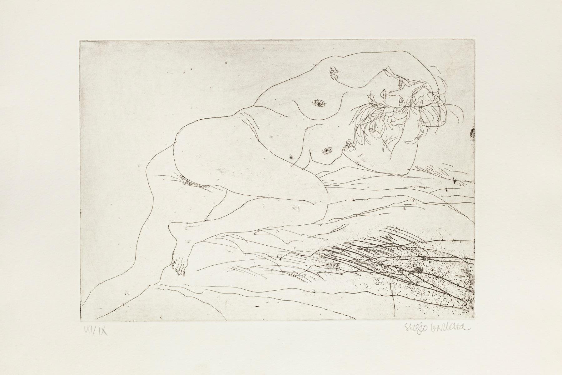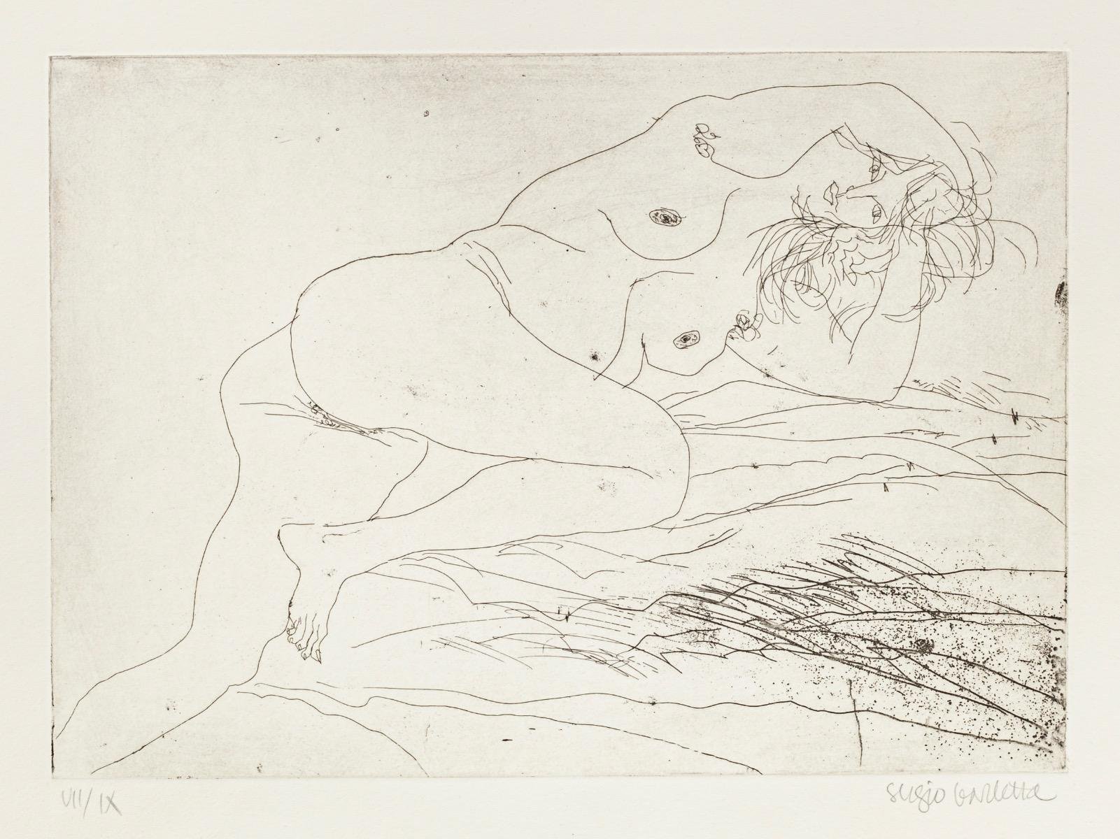 Nude is an original etching on cardboard realized by Sergio Barletta. Hand-signed on the lower right in pencil. Numbered in Roman numerals, edition of VII/ IX prints, on the lower left in pencil. In very good condition. The artwork represents a lying down nude through confident and quick strokes. Sergio Barletta (1934) is an Italian cartoonist and illustrator, who has also published some humorous and political satire books. From the age of 22 is active in Rome, where he worked as an illustrator and art director in some monthly magazines like “Costume”, Diners Club house organ, BP Review, IBM, and others. In 1965 started the joint-working with Marino Gallery in Rome, and in 1966 in Milan with Humour Graphics group, at Levi Gallery and others in the following years. In these years graphic work and illustration are mixed with painting and photography, also with satirical drawings for Rinascita, weekly of the Italian communist party; Azione Sociale, weekly of ACLI Catholic Workers Association; movie posters, advertising for Gucci, some writings for Popular Photography Italiana, lay-outs, writings and illustrations for Avinews, bimonthly for tour operators and so on. During the eighties he starts a long co-operation with satirical weekly “Il Sale”, complemented by a book with Ottaviano edizioni in Milan and others publications in Turin and Rome, all of satirical drawings. In this period he collaborates with Linus, the most important Italian comics monthly, and Harakiri, a humour weekly published in France. Personal and group exhibitions of paintings, collages, drawings, photographs Galleria Marino – Roma, 1965 Galleria Levi – Milano, 1966 Galleria Petronio – Bologna, 1967 Galleria d’arte moderna Villa Reale – Milano, 1967 Palazzo Costanzi – Trieste, 1967 Galleria del Naviglio – Milano, 1967 Galleria Marino – Roma, 1967 Galleria Libreria Renzo Cortina – Milano, 1968 Galleria Libreria Renzo Cortina – Milano, 1969 Society Art’s Club – Messina, 1970 Galleria Marino – Roma, 1970 Galleria Libreria Renzo Cortina – Milano, 1972 Galleria Marino – Roma, 1972 Galleria Il Diaframma – Milano, 1973 Galleria Libreria Renzo Cortina – Milano, 1974 Galleria Il Ventaglio – Firenze, 1975 Galleria Marino – Roma, 1975 Palazzo Gonfalonieri – Milano, 1976 Bedford House Gallery – London, 1977 Galleria Apicella – Bonn, 1979 Civico Museo Archeologico – Milano, 1980 Palazzo Barberini – Roma, 1981 Palazzo delle Stelline – Milano, 1981 Castello Sforzesco Biblioteca Trivulziana – Milano, 1982 Civico Museo Archeologico – Milano, 1983 Biblioteca Sormani – Milano, 1983 Club Migros – Milano, 1985 Centrodomus – Milano, 1985 Galleria Vittorio Emanuele – Milano, 1988 Galleria d’Arte ex libris – Roma, 1989 Civico Museo Archeologico – Milano, 1989 Palazzo delle Stelline – Milano, 1990 Palazzo d’Arte – triennale Milano, 1991 Galleria Molica Guid’Arte – Roma, 1991 Molica Gallery, West Broadway – New York, 1991 Civico Museo Archeologico – Milano, 1992 Palazzo Mediceo – Serravezza, 1994 Lalit Kala Akademi – New Delhi, 2005 Birla Academy of Art and Culture – Calcutta, 2005 Galleria Marino – Roma, 2011