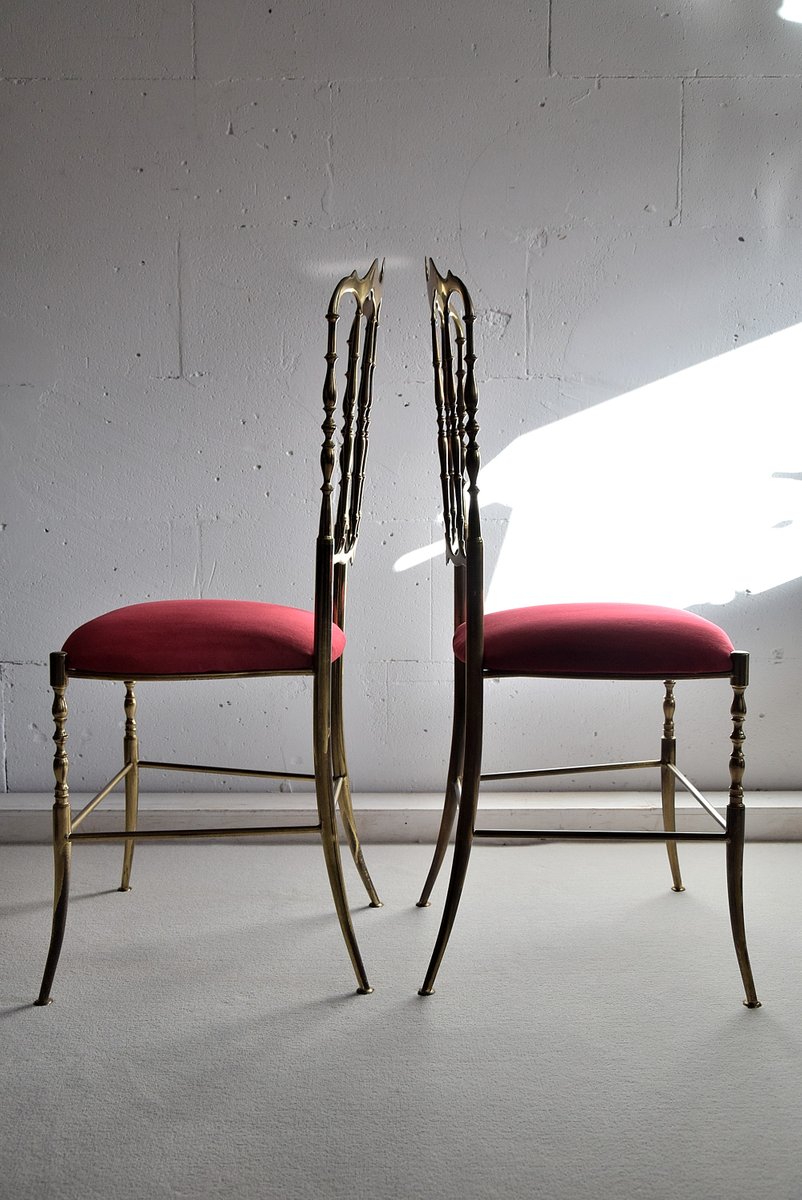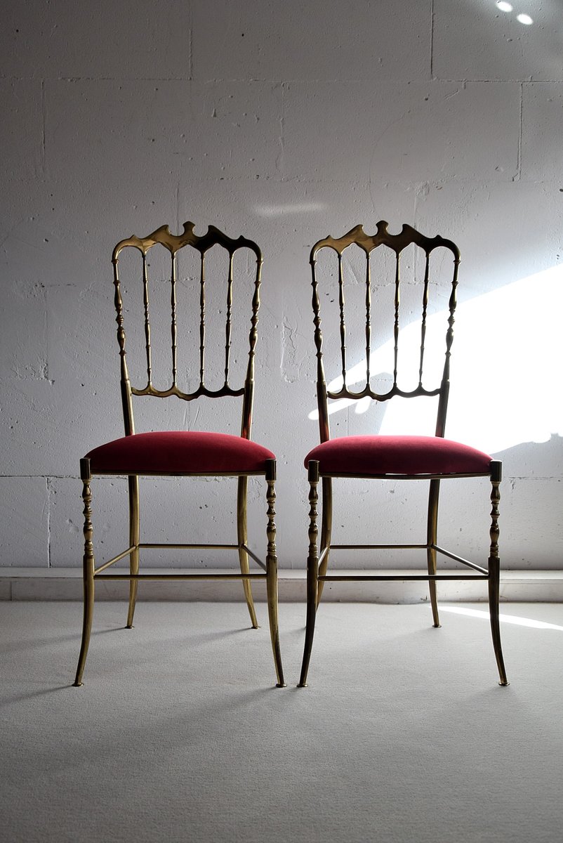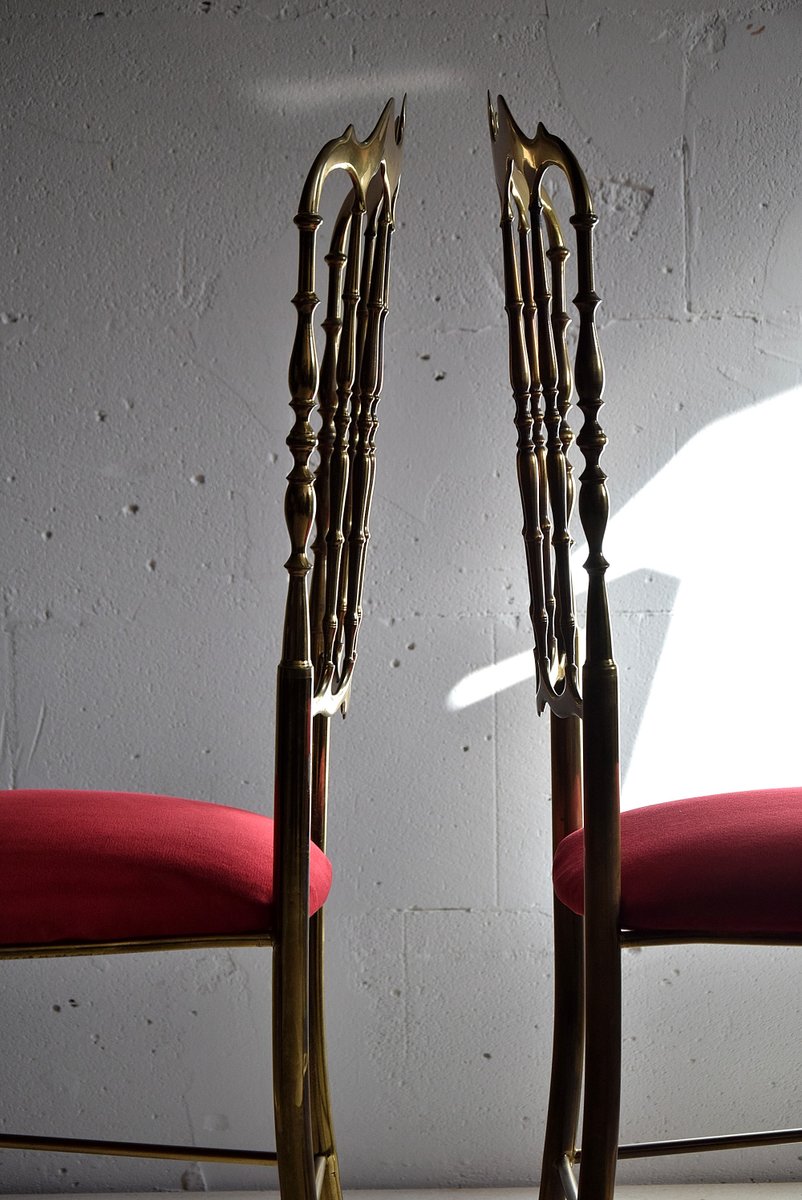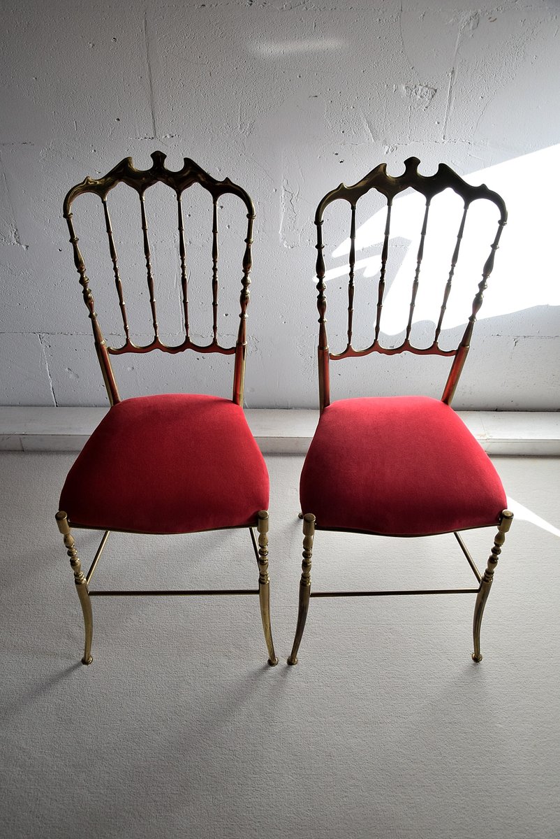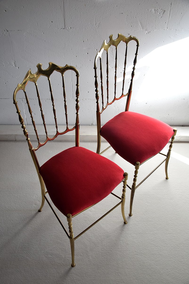 Set of Brass & Red Velvet Chiavari Chairs, 1950s