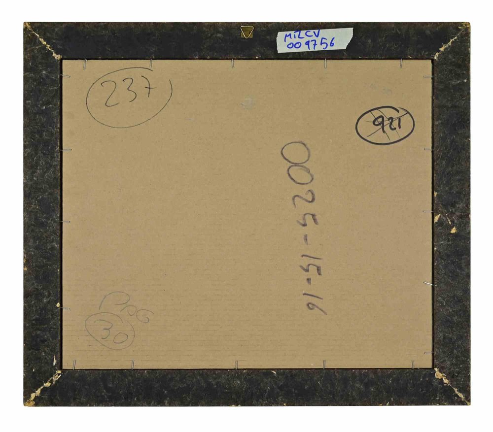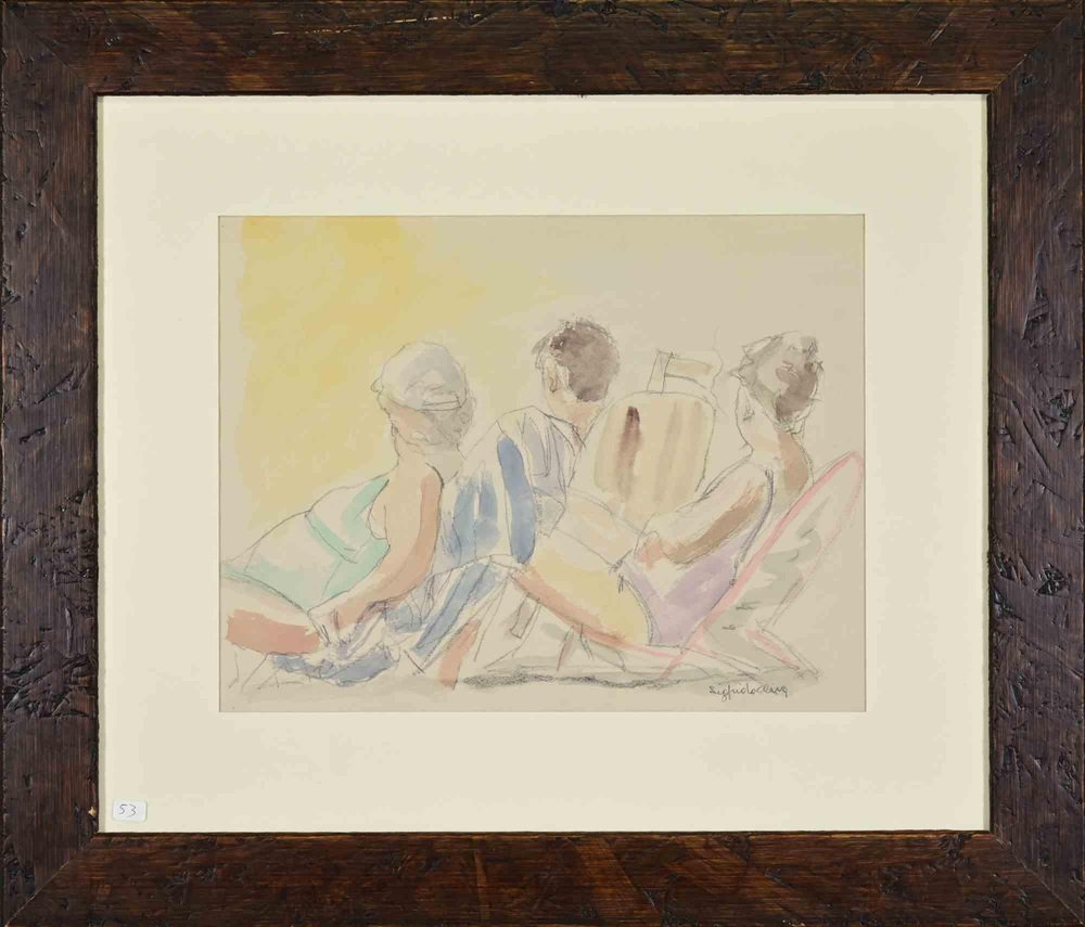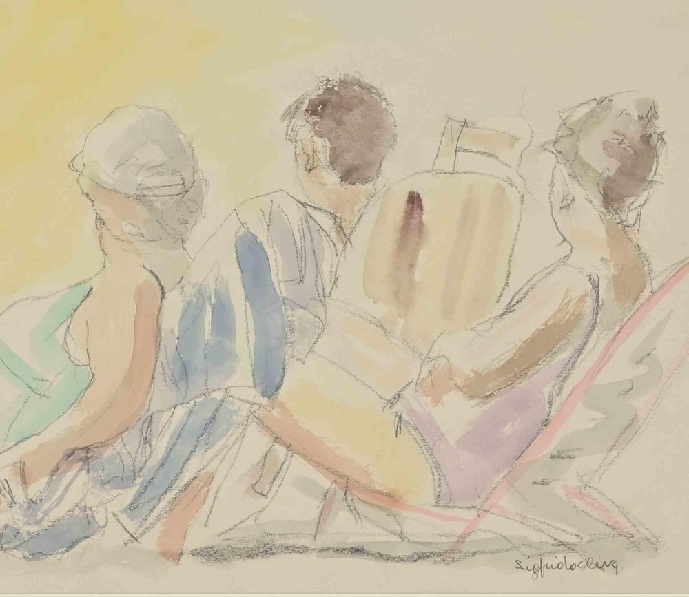 Sigfrido Oliva, At the Beach, Pencil and Watercolor, 1980s, Framed