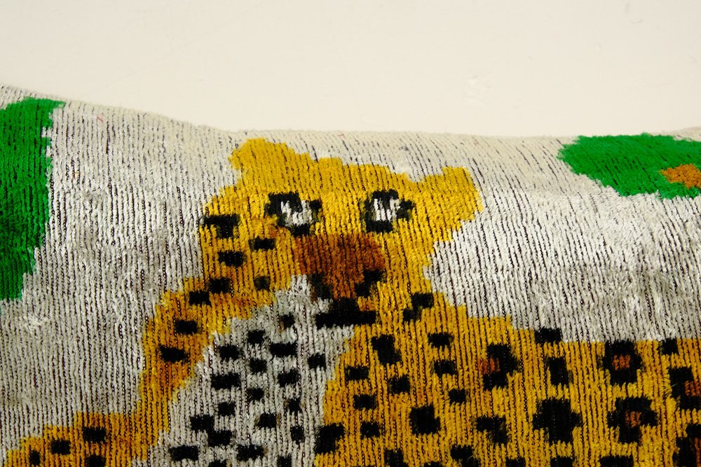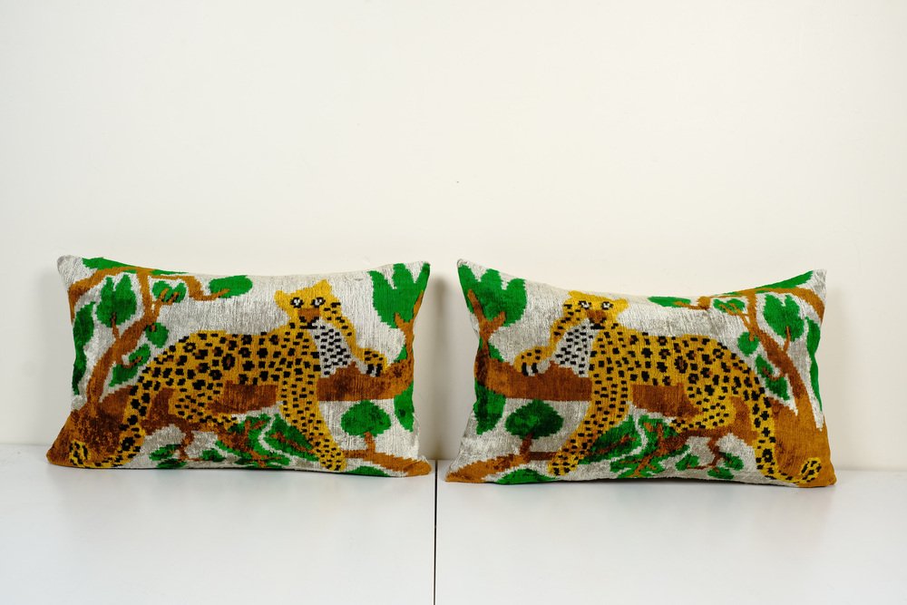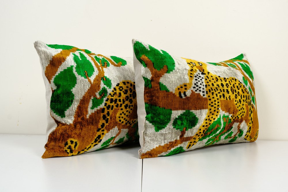 Silk Ikat Velvet Animal Cushion Covers with Tree Design, Set of 2