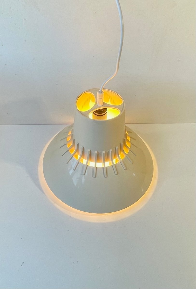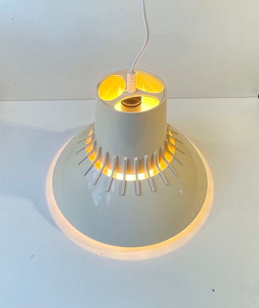 Nordisk Solar used its expertise in using plastic for the production of radio sets, to create many colorful plastic lighting fixtures in the late-1950s and 1960s. The company also commissioned notable Danish architects and designers including Sigvard Bernadotte, Acton Bjørn, Max Brüel, Vagn Dyring, Anton Fogh Holm, Jørgen Kastholm & Preben Fabricius, Eva and Nils Koppel, Sven Middelboe, and Jørn Utzon—who later designed the Sydney Opera House—to create lighting fixtures for Solar. The manufacturer’s most iconic productions include Sven Middleboe’s Verona Pendant Lamp (1960s); Jørn Utzon’s Tivoli Pendant (1947-48, renamed P254 and reintroduced in the 1960s) and Navy Pendant or Sovaernspendel (1956)—which was created for the Royal Danish Navy offices, and was later updated and re-launched by Louis Poulsen under the new name Doo Wop; K Kewo’s Minisol Light (1960s); Preben Fabricius & Jørgen Kastholm’s P376 (1964, renamed Kastholm Pendant in 1980); and Vagn Dyring’s Granada Light (1982).