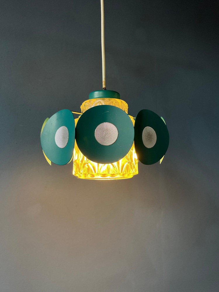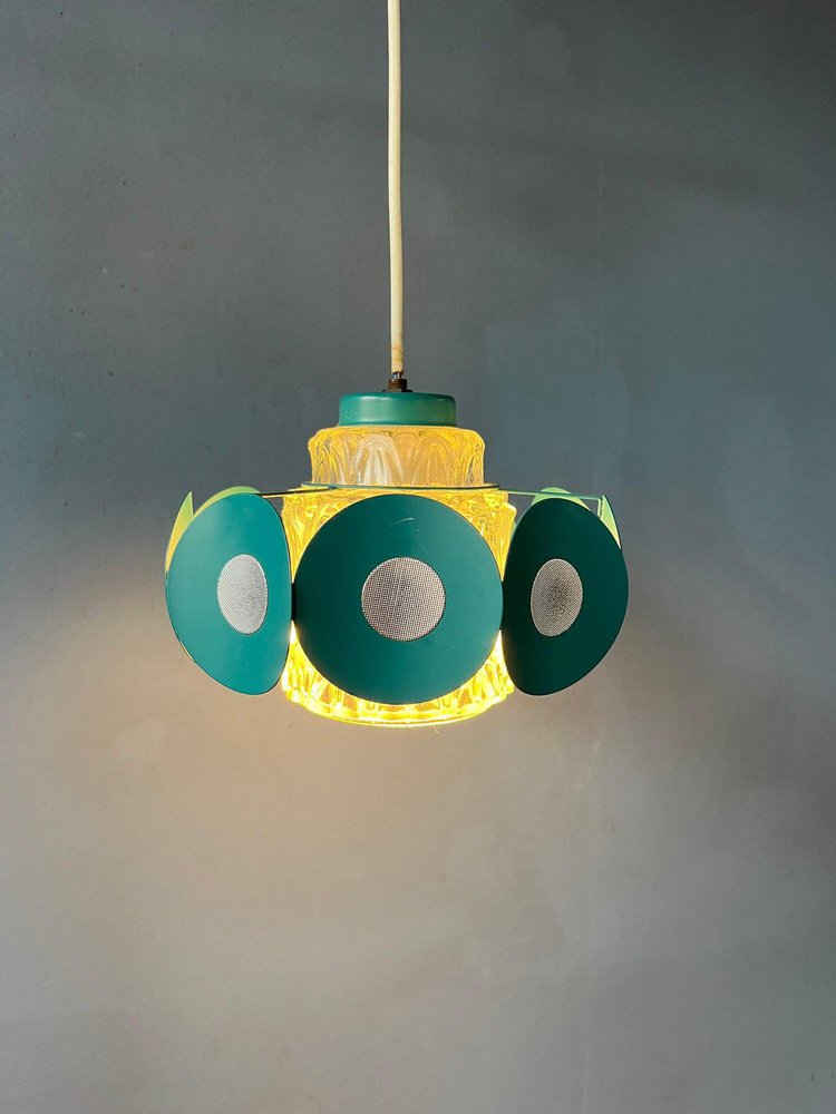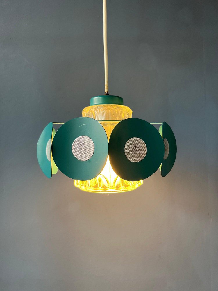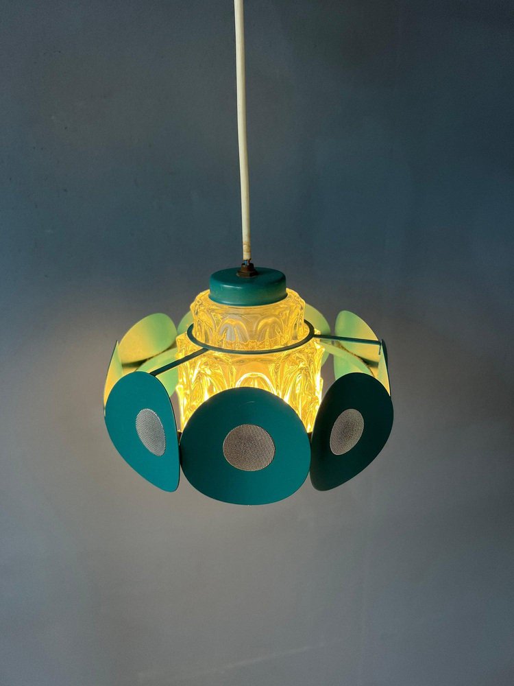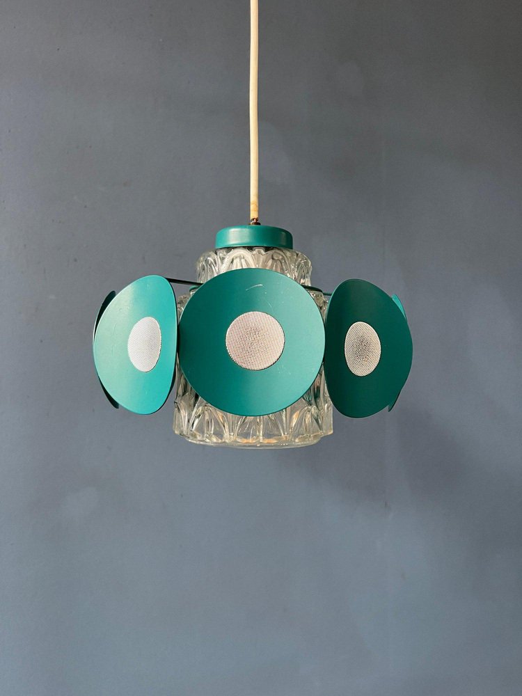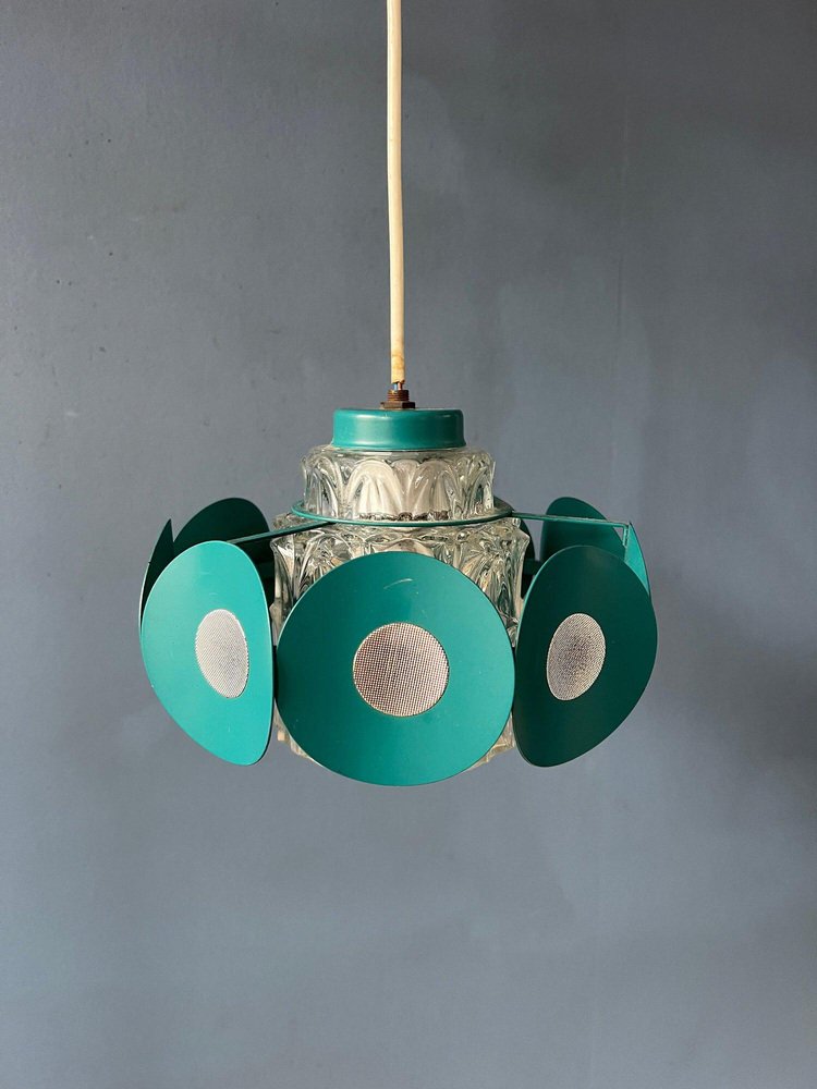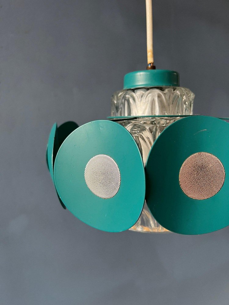 Space Age Pendant Lamp with Glass Shade and Green/Blue Metal Frame