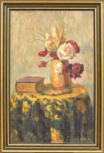 Still Life with Flowers and Book, Oil on Canvas, 20th Century