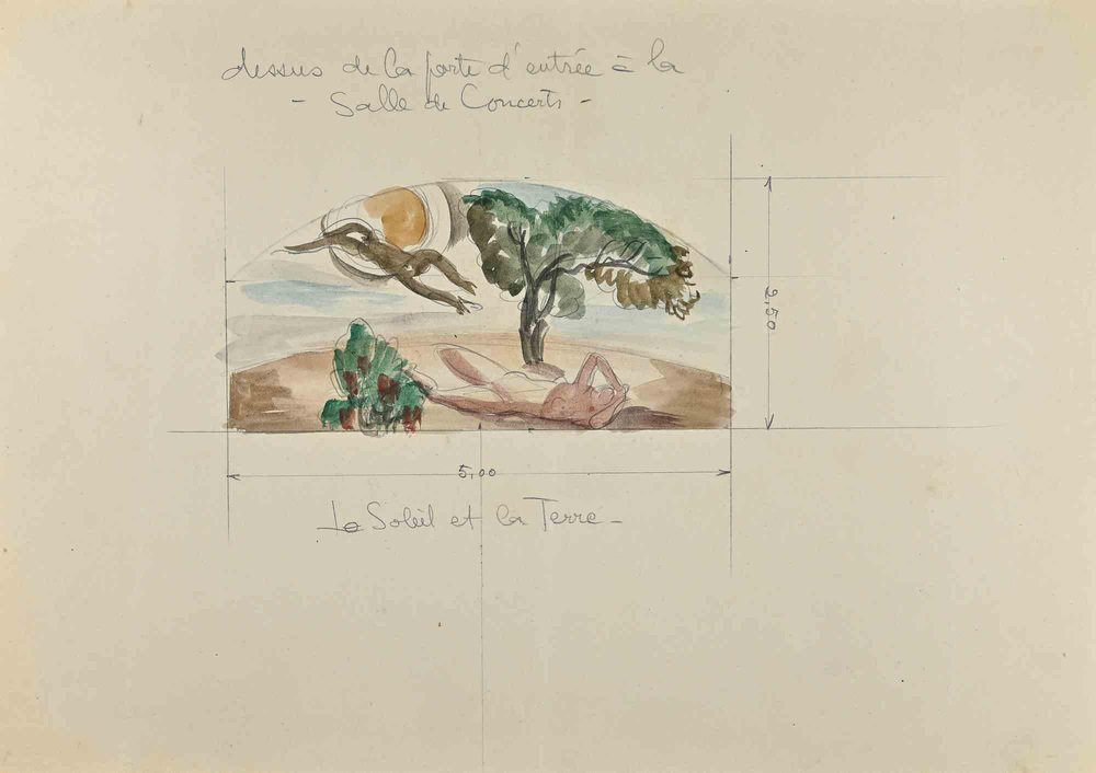 The Sun and the Earth, Drawing in Pencil & Watercolor, Early 20th-Century