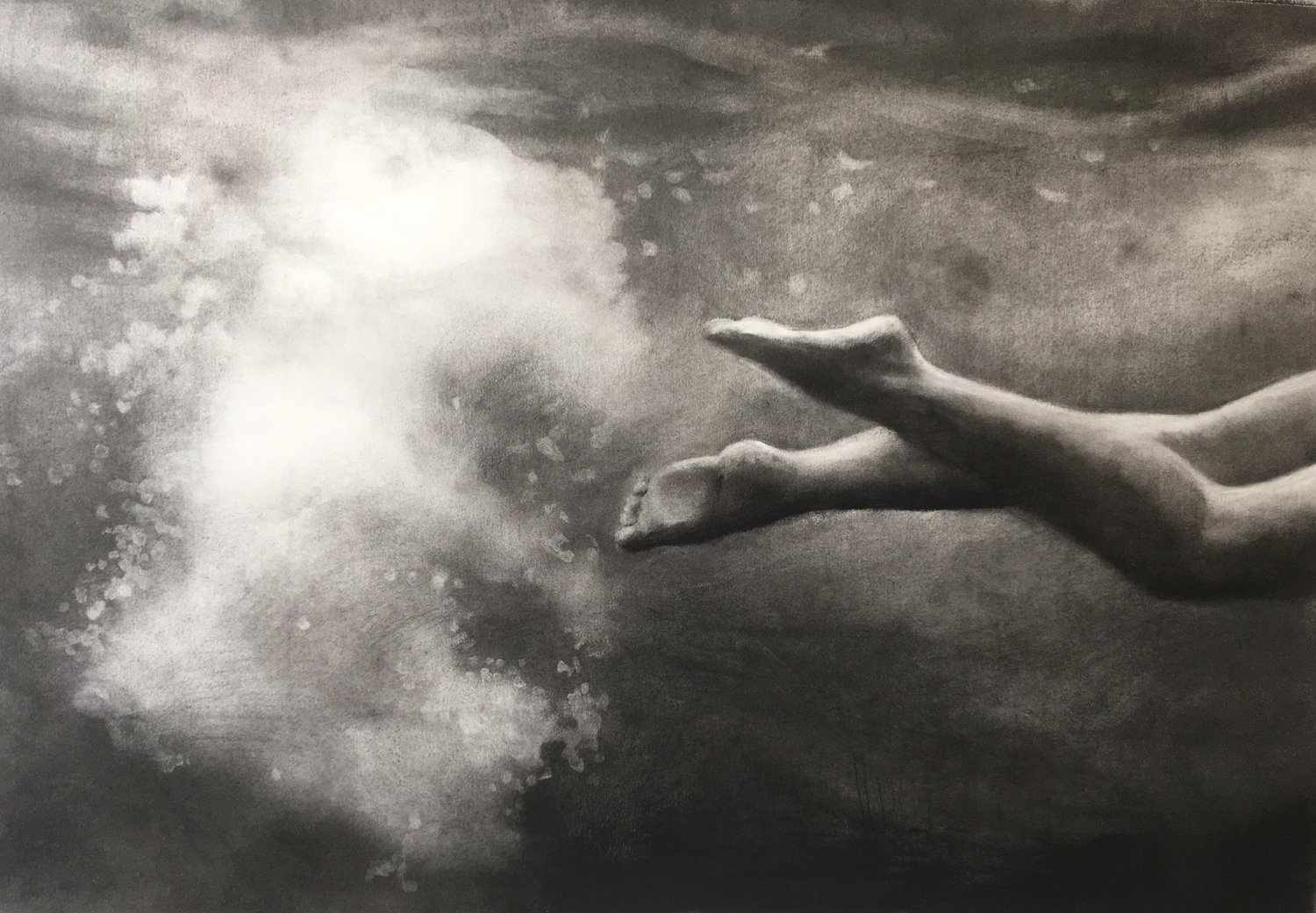 Trailblazer by Patsy McArthur, Charcoal Drawing, Underwater Diver and Bubbles, 2019