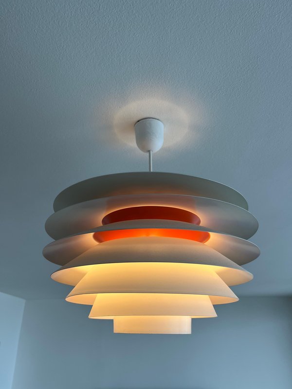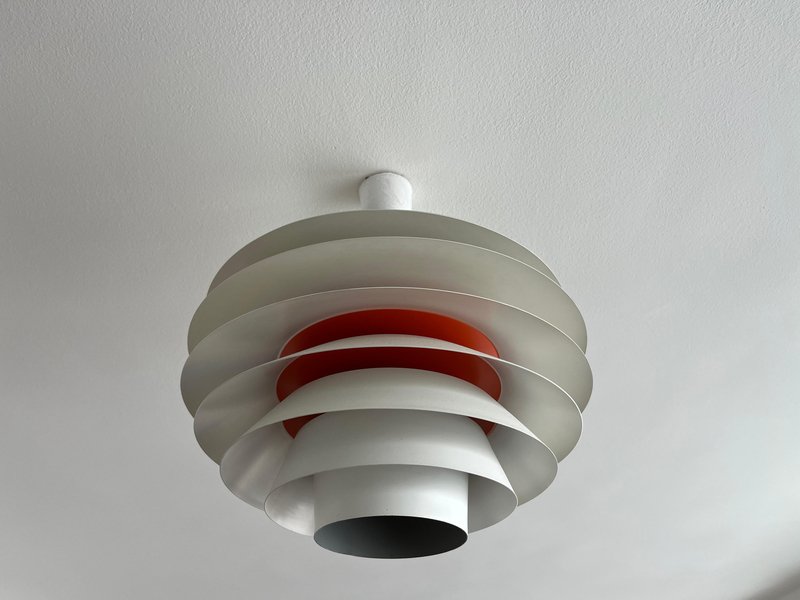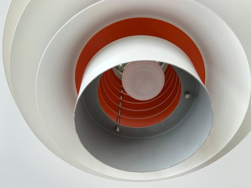 Nordisk Solar used its expertise in using plastic for the production of radio sets, to create many colorful plastic lighting fixtures in the late-1950s and 1960s. The company also commissioned notable Danish architects and designers including Sigvard Bernadotte, Acton Bjørn, Max Brüel, Vagn Dyring, Anton Fogh Holm, Jørgen Kastholm & Preben Fabricius, Eva and Nils Koppel, Sven Middelboe, and Jørn Utzon—who later designed the Sydney Opera House—to create lighting fixtures for Solar. The manufacturer’s most iconic productions include Sven Middleboe’s Verona Pendant Lamp (1960s); Jørn Utzon’s Tivoli Pendant (1947-48, renamed P254 and reintroduced in the 1960s) and Navy Pendant or Sovaernspendel (1956)—which was created for the Royal Danish Navy offices, and was later updated and re-launched by Louis Poulsen under the new name Doo Wop; K Kewo’s Minisol Light (1960s); Preben Fabricius & Jørgen Kastholm’s P376 (1964, renamed Kastholm Pendant in 1980); and Vagn Dyring’s Granada Light (1982).