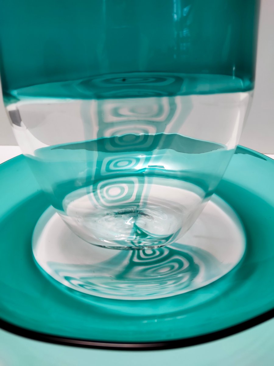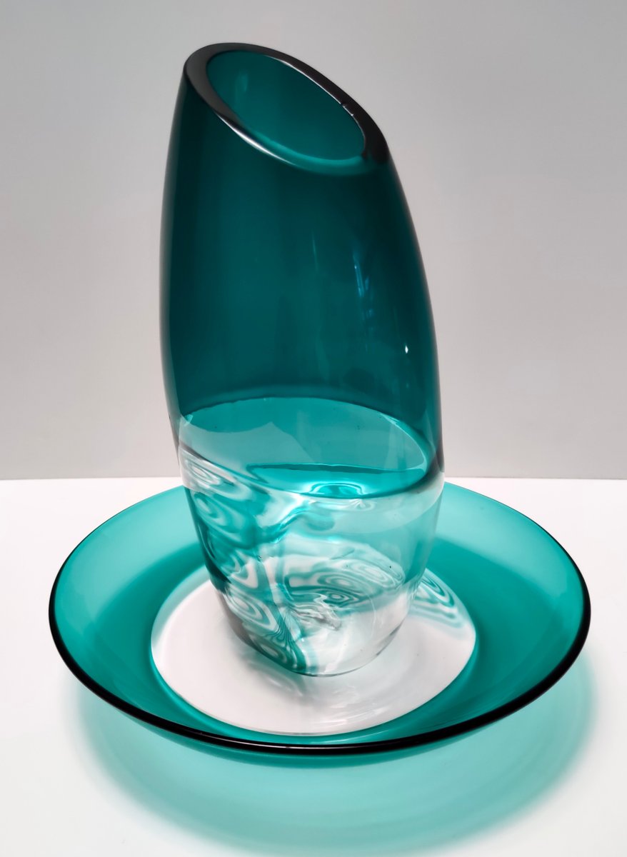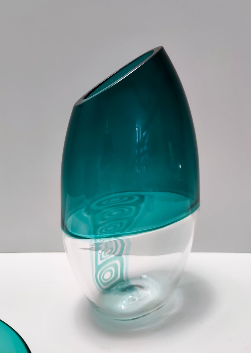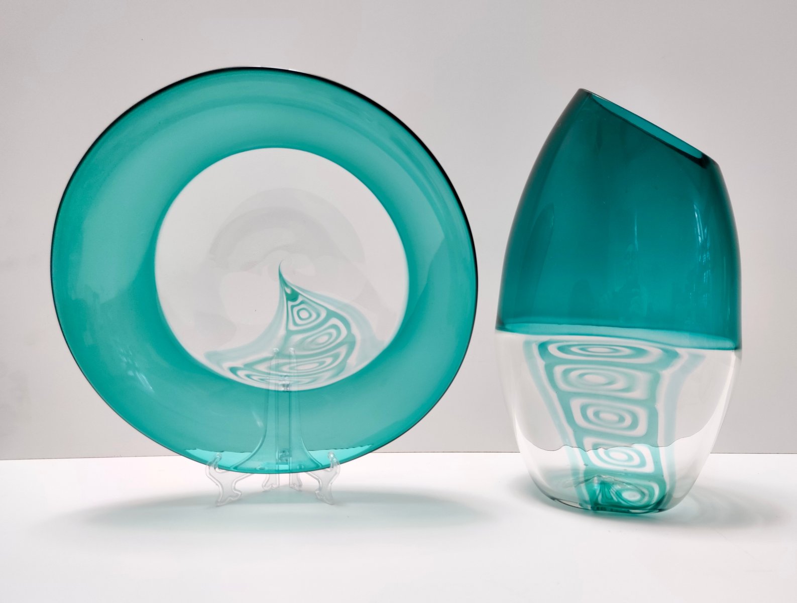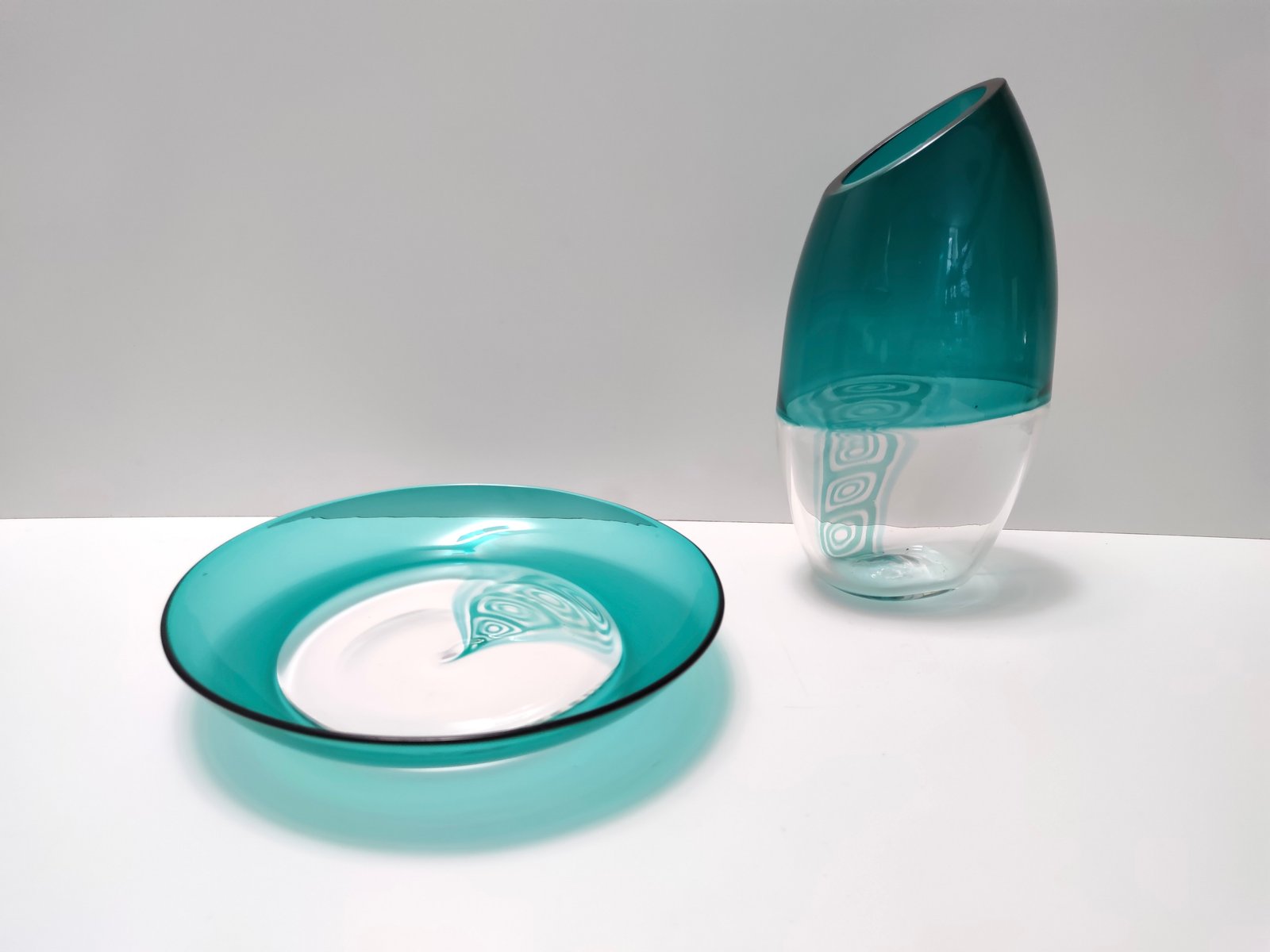 Vintage Italian Teal Murano Glass Plate and Vase by La Murrina, 1970s, Set of 2
