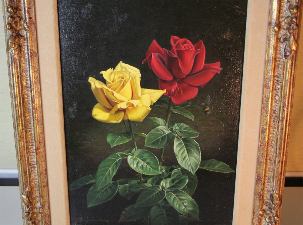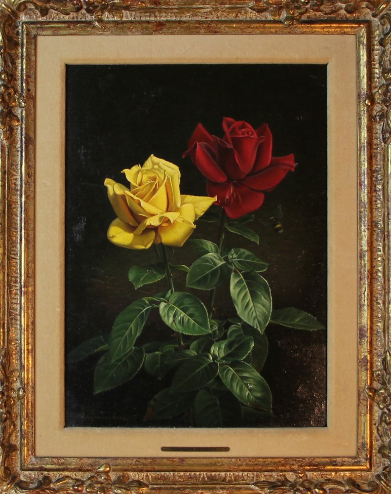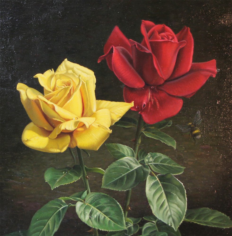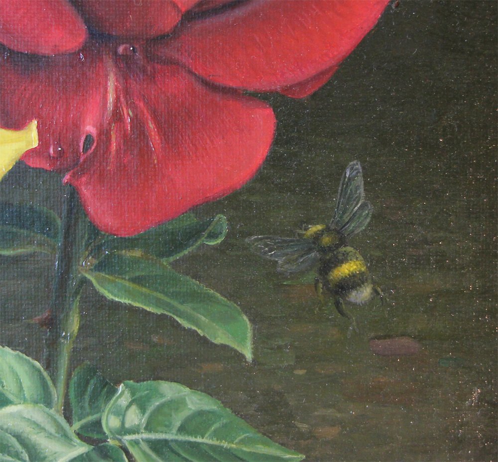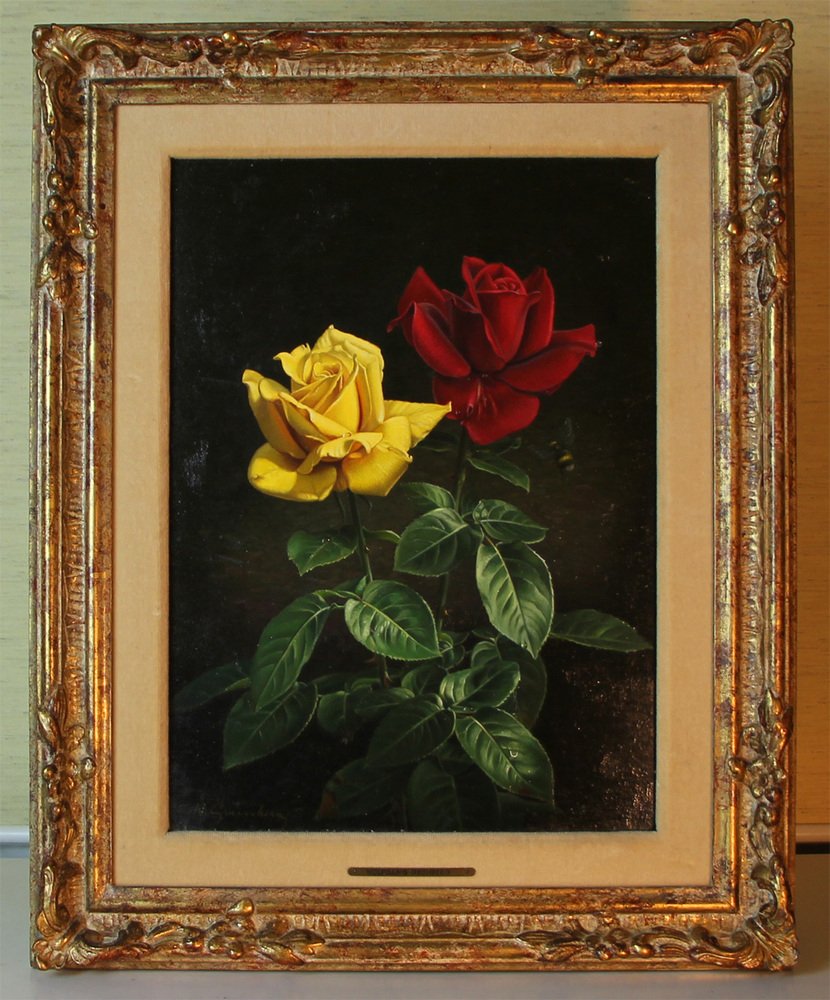 Wolfgang Grünberg, Two Roses with Bumblebee, 1960s, Oil on Canvas, Framed