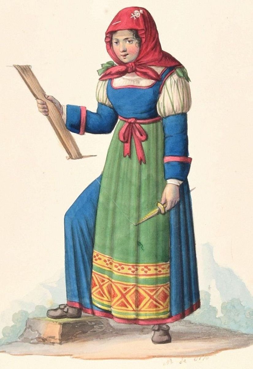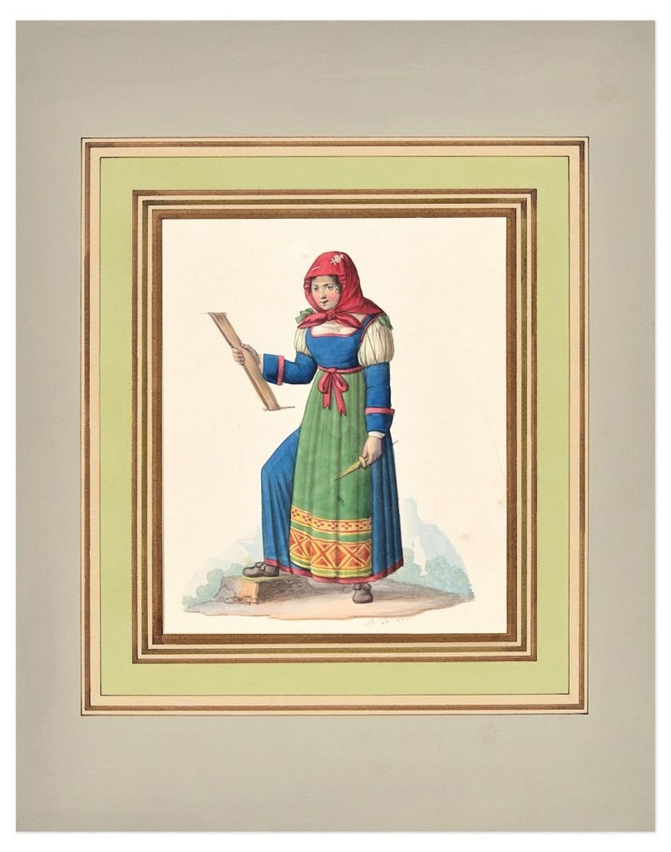 Woman in Costume - Original Ink Watercolor by M. De Vito - Early 1800 Early 19th Century